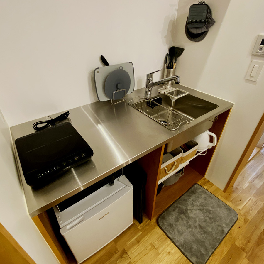 The kitchen on the second floor is equipped with the minimum facilities needed for cooking, such as an induction cooking heater, refrigerator, and microwave.