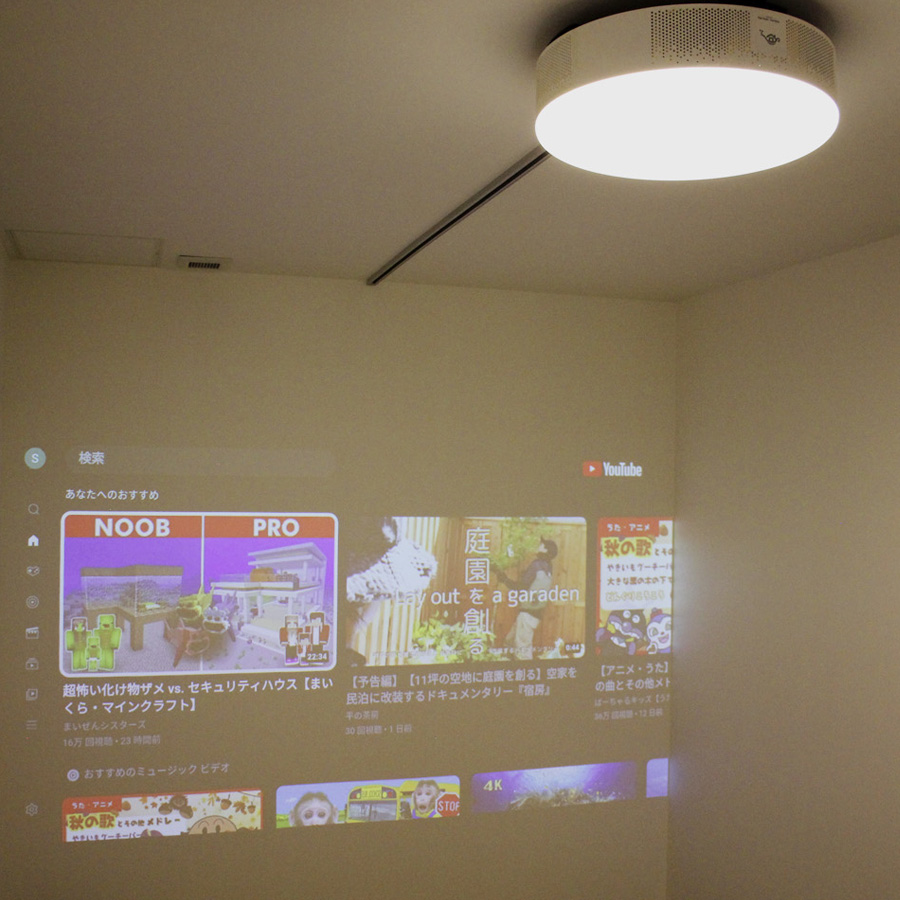 The living room on the first floor is equipped with a ceiling light with a projector, "popIn Aladdin 2." It can project images onto the white wall, so it can be enjoyed as a theater room.